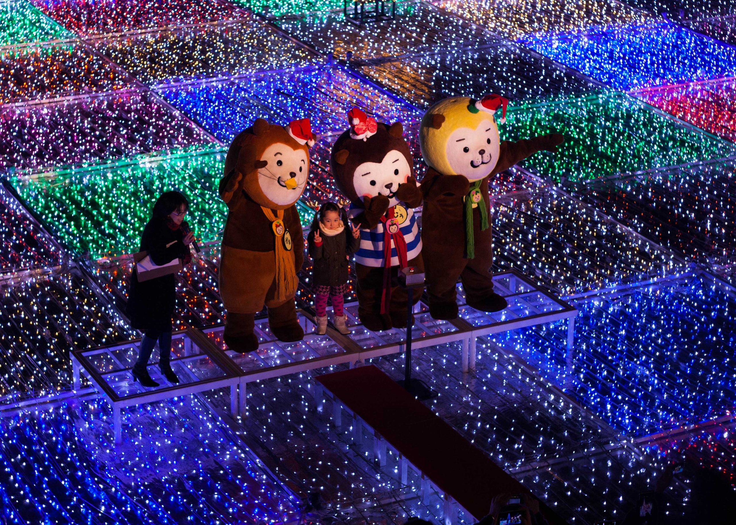 We were early enough to see the lights being switched on (around 6pm): a cute little girl had the honour of pushing a big, red button. She was assisted by the park’s staff and Miyazaki-ken mascots, and the crowd who counted down the big event. It was all very dramatic and exciting.