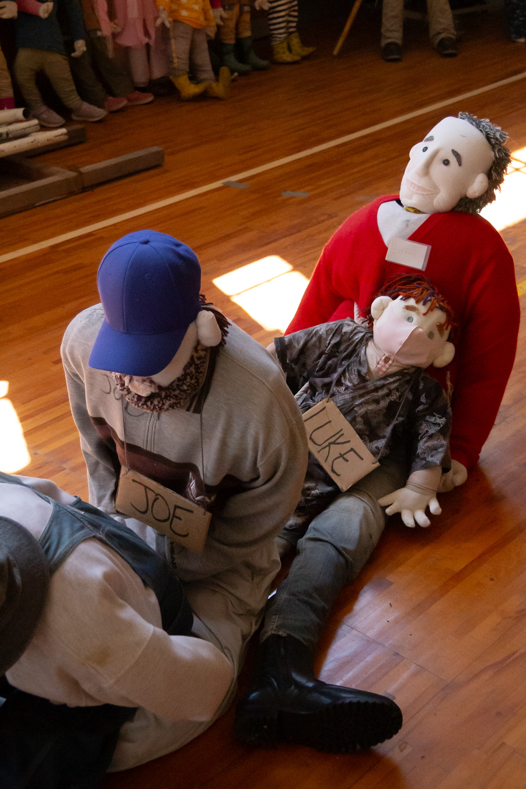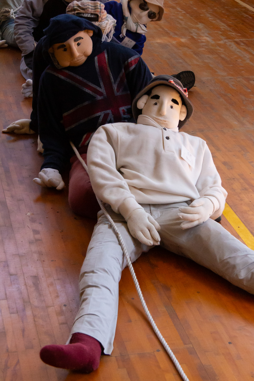Ayano-san starts creating each doll with the head first, using two crossed wood sticks wrapped in cloth and stuffed with old clothes and cotton. Buttons and yarn are used to attach eyes and hair. Sometimes, a marker is used to add details, like eyebrows or a mustache. Then, she uses “sticks” made from rolled newspaper tied with wires to add the arms and legs. To finish, each doll is dressed in clothes and accessories and posed around the village.