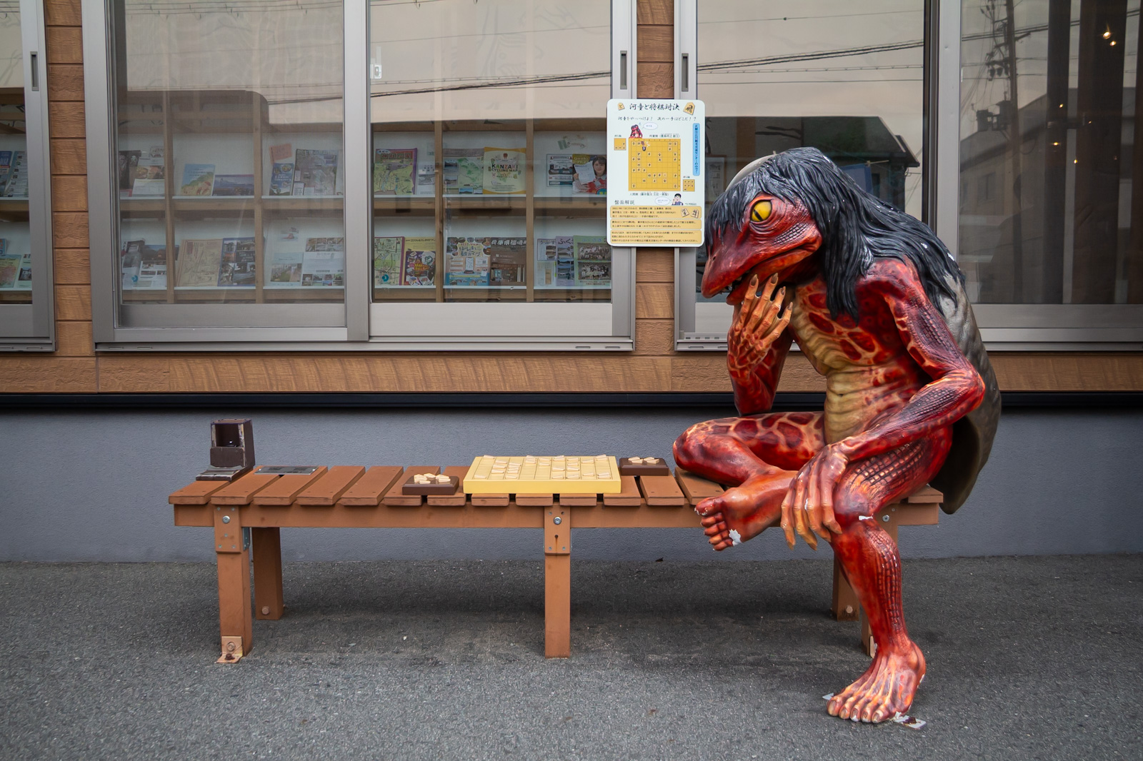 There are three yokai benches in this area: Kappa and Kuwazunyoubou outside the center, and Umibozu across the road in front of the Matsui Butcher. Umibozu is a sea ogre that attaches itself to boats. Sometimes, it will ask to borrow a ladle, and if you don’t give it one with a hole in the bottom, it will waterlog your boat.